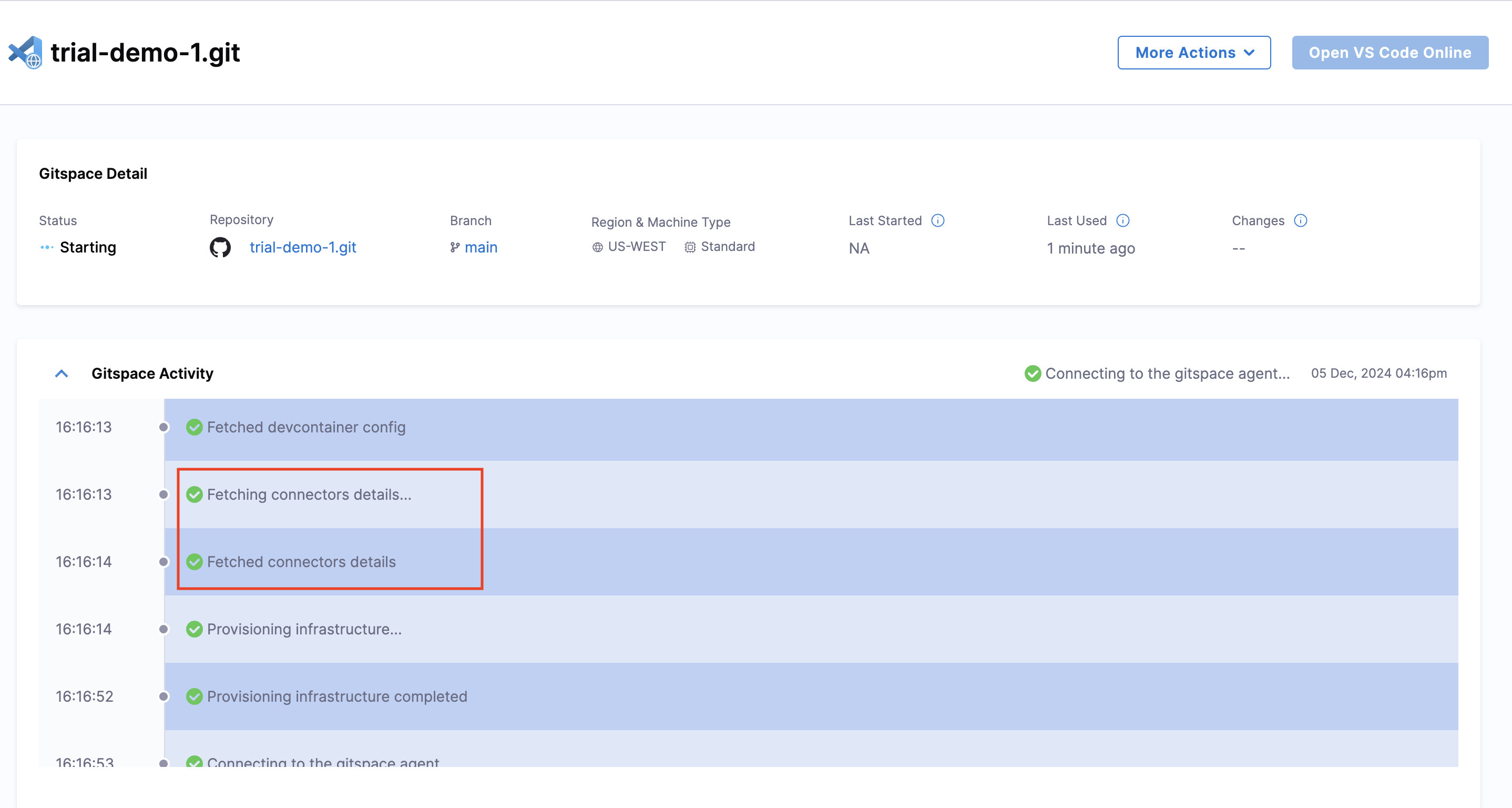 Once the Gitspace is created, you can verify the setup by checking the container logs and status stages. If everything is set up correctly, your Gitspace will run using your private Docker image.