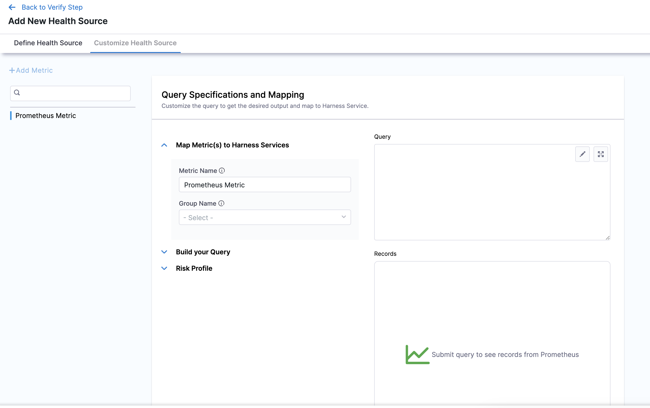 The subsequent settings in Customize Health Source depend on the Health Source Type you selected. You can customize the metrics to map the Harness Service to the monitored environment.