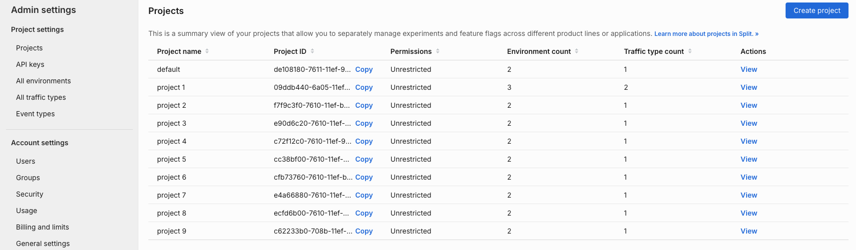 Projects allow you to separately manage your feature flags and experiments across your different business units, product lines, and applications. When you first create your account, you're provided with one project named Default.