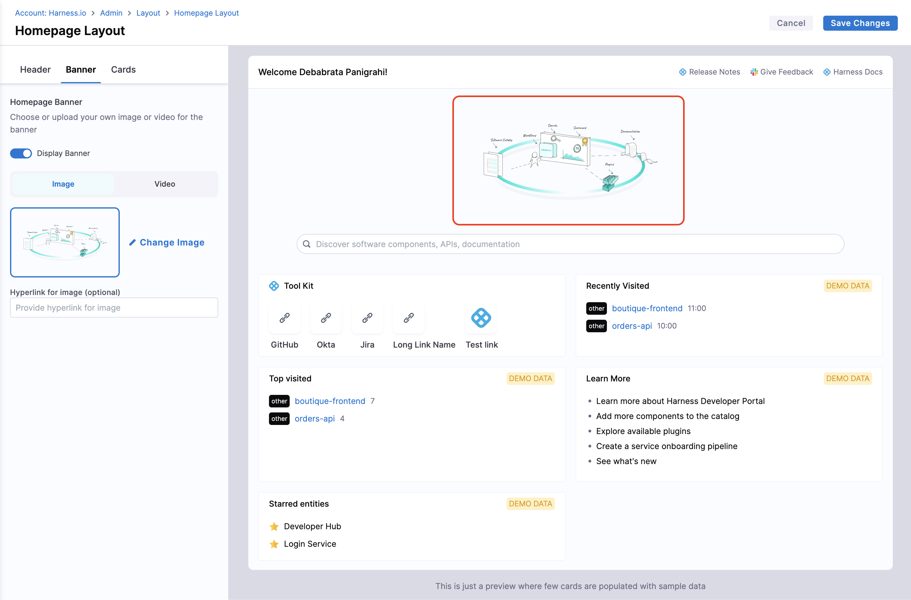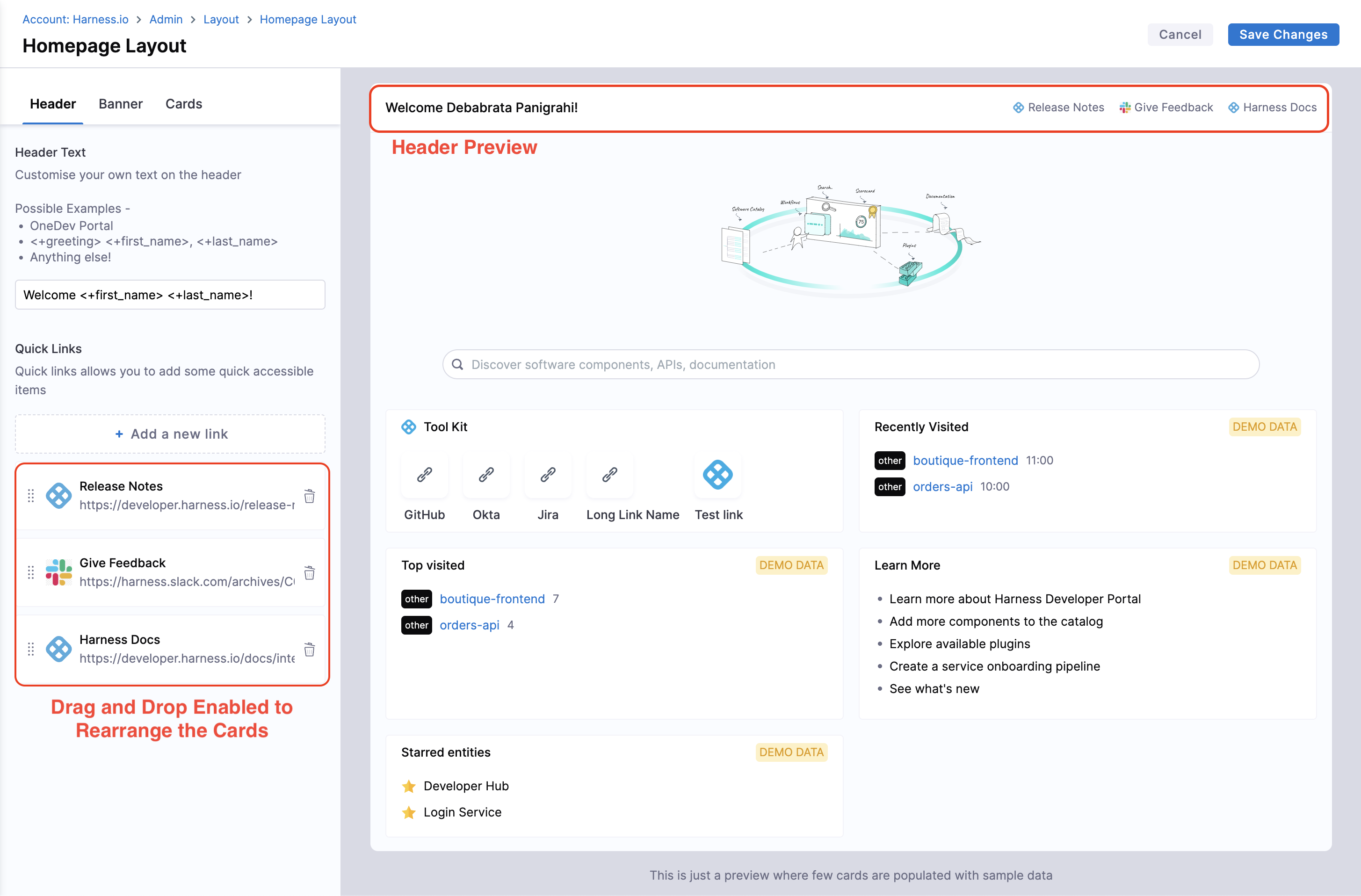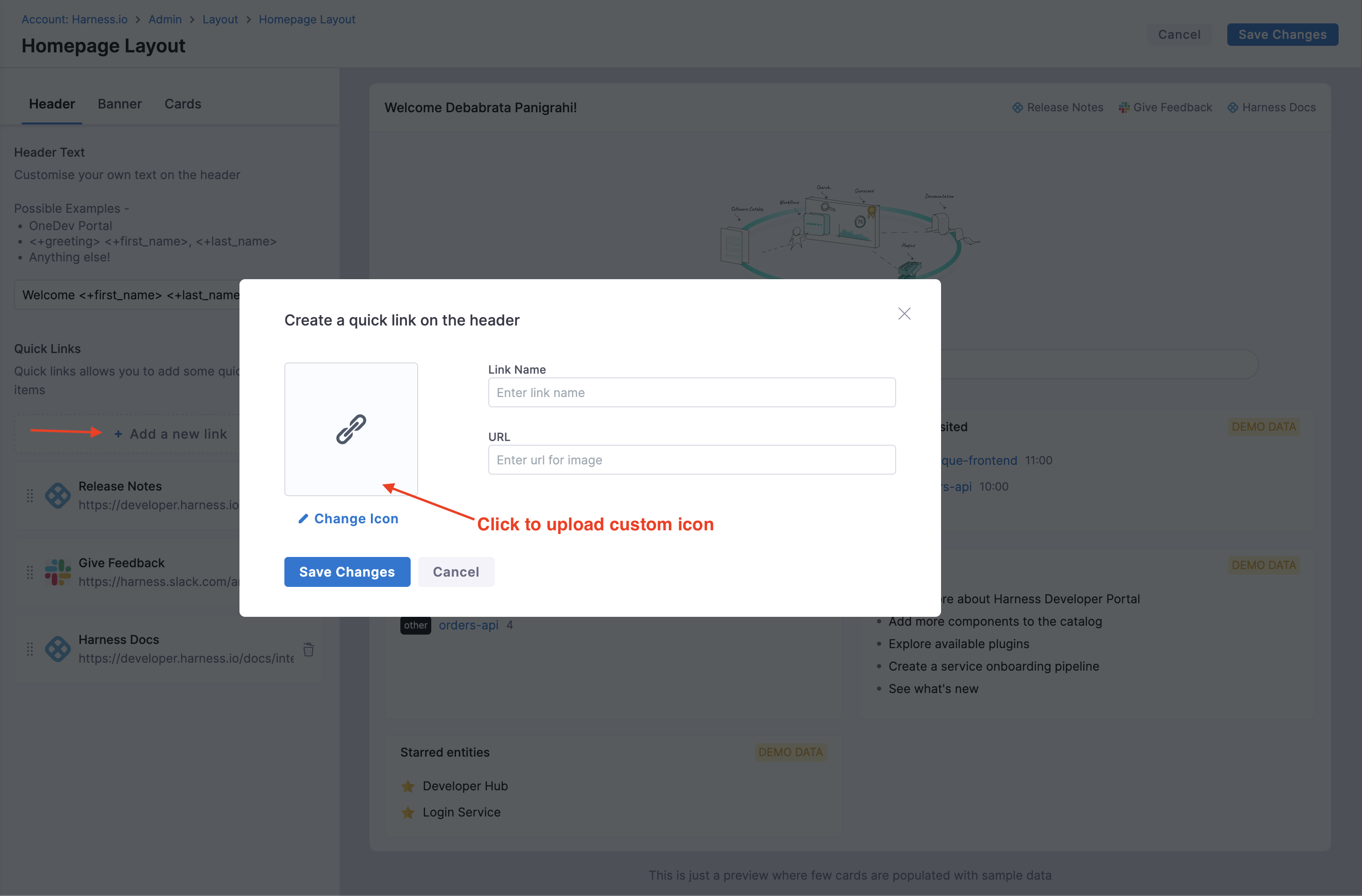 Homepage of IDP is meant to provide personalized view for developers, serving as a single pane of glass for all the necessary information required across tools and software systems in use, and it differs for different organization as well as different teams in an organization. So to help with varied use-cases, you can customize the homepage, add quick links in the headers, change text on the header, banner and cards according to your engineering org and make it useful for your developers.