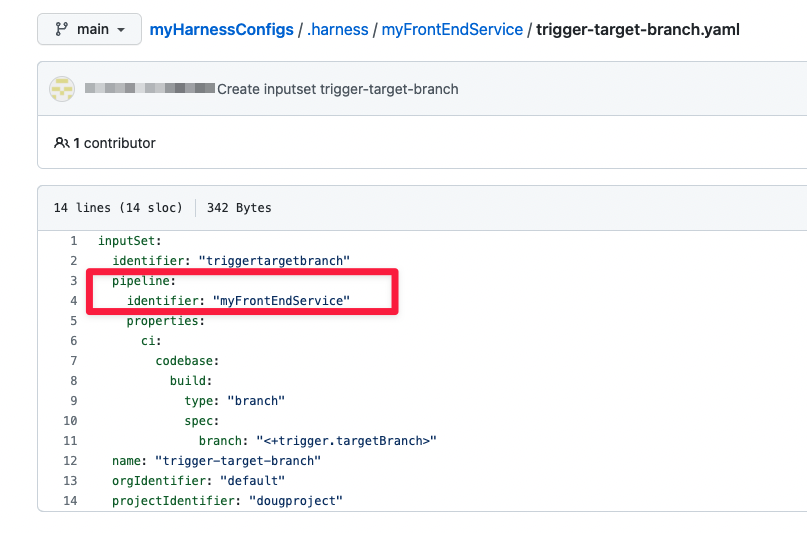 You now have a pipeline, input set, and trigger for your codebase. The pipeline and input set are in one repo, myHarnessConfigs. The code is in another repo, myFrontEndService. Note that both repos have the same default branch, main. When your trigger receives a matching payload, it starts a build using the pipeline in myHarnessConfigs. The trigger uses its pipelineBranchName element in its YAML definition and uses the pipeline in this branch (main) to run the build.